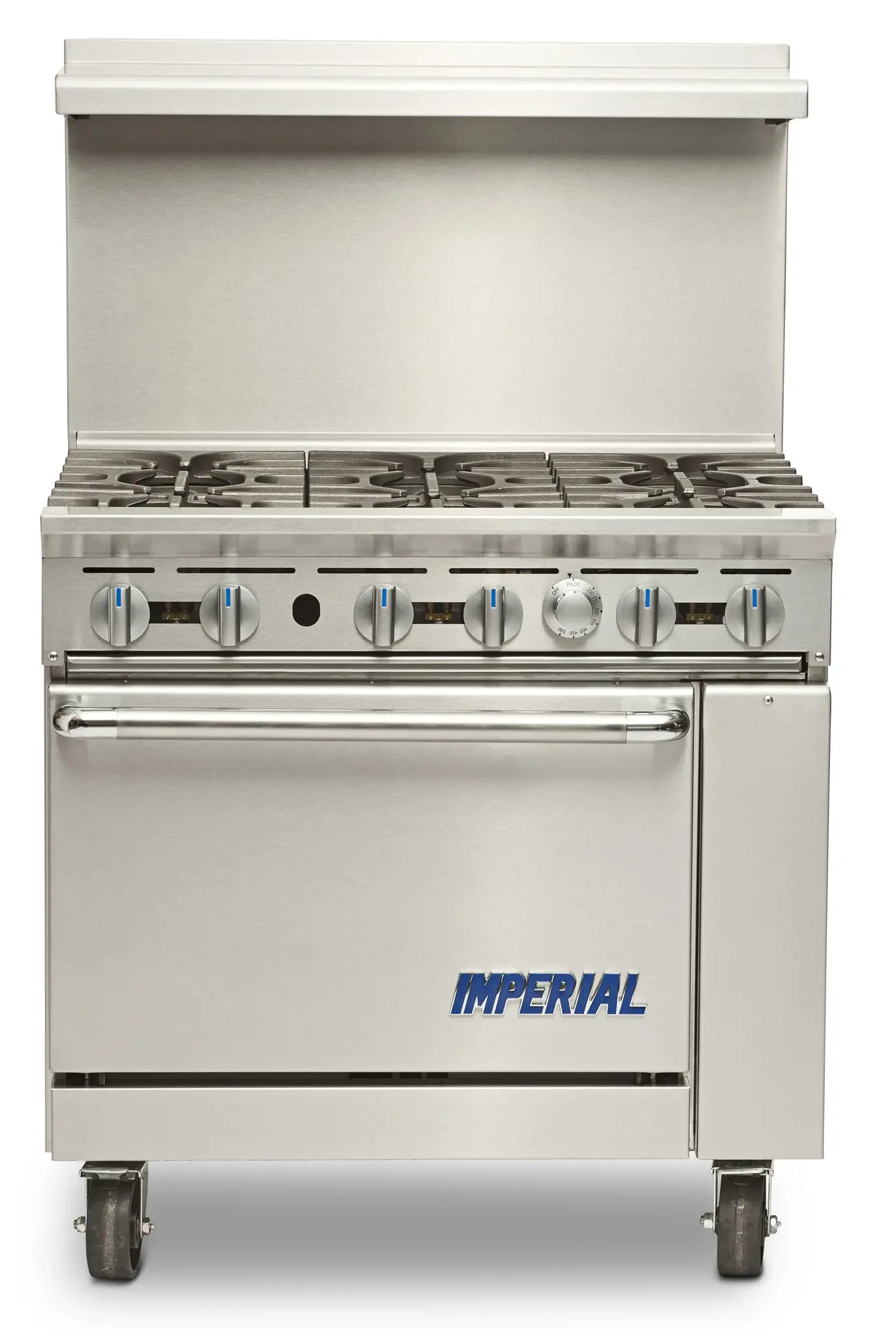 Unleash your kitchen's potential with the Imperial IR-6 Range, a powerful and versatile addition to any commercial restaurant. This 36" gas range features six open burners, allowing you to simultaneously cook multiple dishes with precision and efficiency. The standard oven comes with a chrome rack, providing ample space for baking and roasting. The removable crumb tray makes cleaning a breeze, ensuring a hygienic cooking environment. Crafted with a stainless steel front, sides, backguard, landing ledge, and kick plate, this range is not only durable but also adds a sleek and professional look to your kitchen. The adjustable feet and 6" legs provide stability and flexibility in installation. With a whopping 227,000 BTU, this NSF, CE, CSA Flame, and CSA Star certified range delivers exceptional performance and reliability. Elevate your culinary creations with the Imperial IR-6 Range.