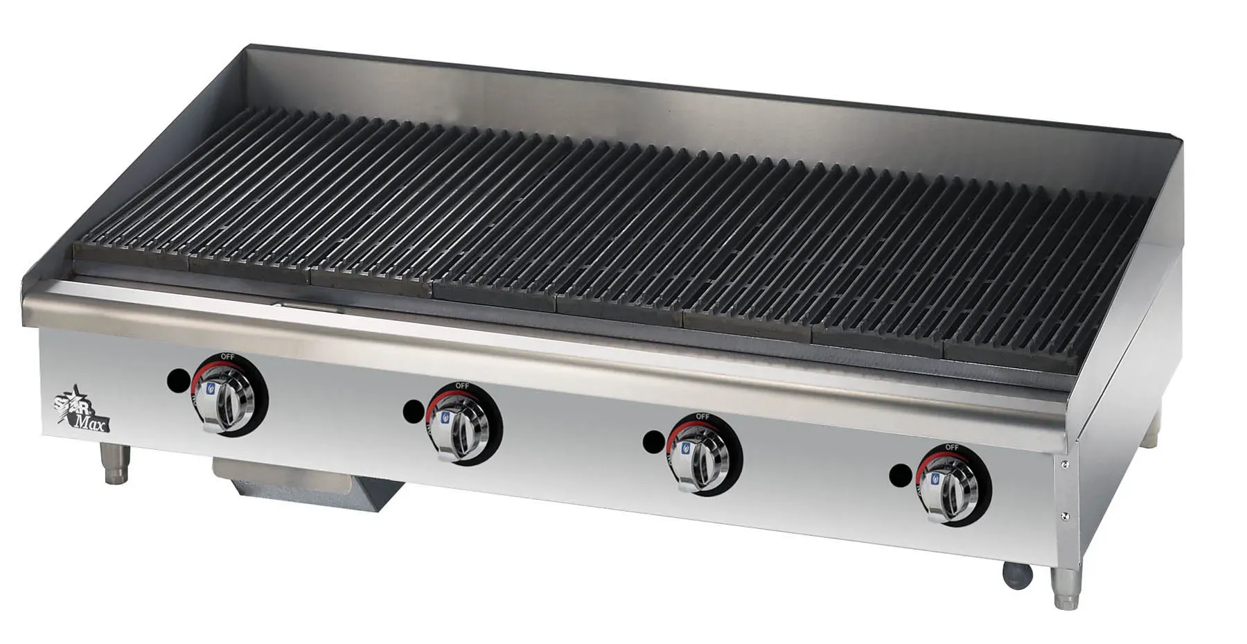 Star-Max radiant and lava rock charbroilers are designed to provide excellent heating and control when preparing a wide variety of products. The units are designed with durability and flexibility in mind with cast iron burners and a control knob for each twelve 12 inch section. The grates have been designed to hold a high capacity of product for maximum efficiency under demanding cooking situations.